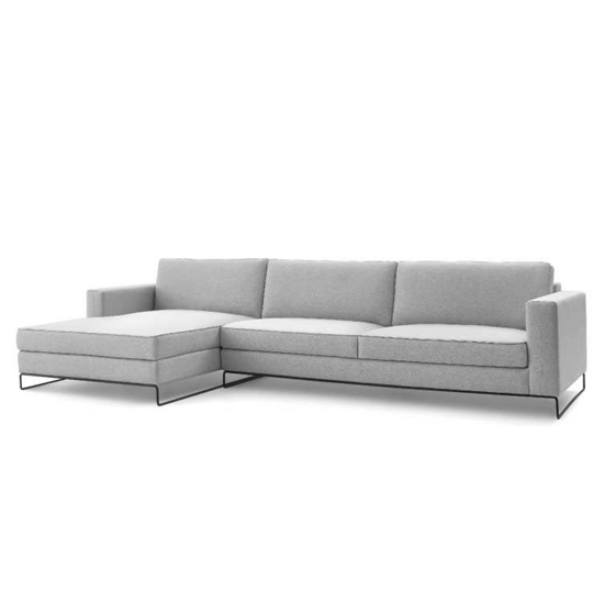 Sofá de living, chaise-longue fixa e mesa lateral.