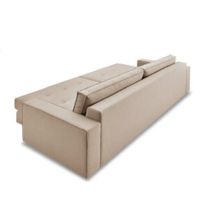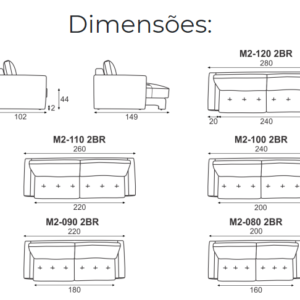 Sofá extensível com deslizamento tubular, com braços desmontáveis, detalhe de costura no assento e trava aberto e fechado.